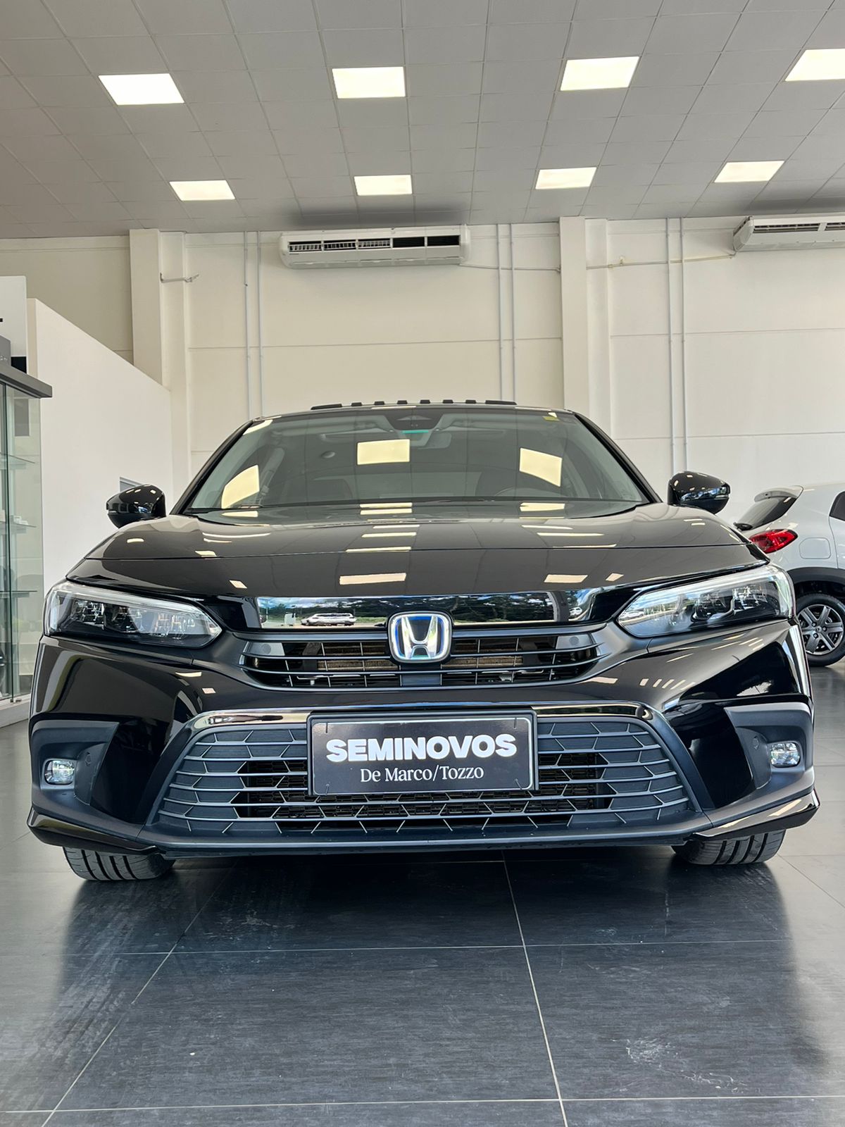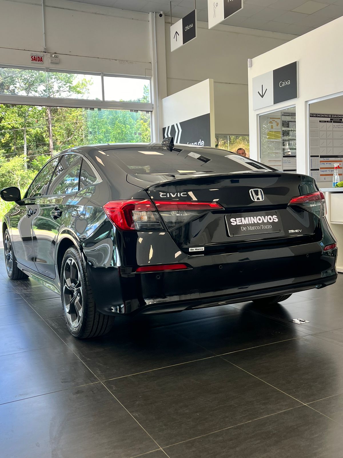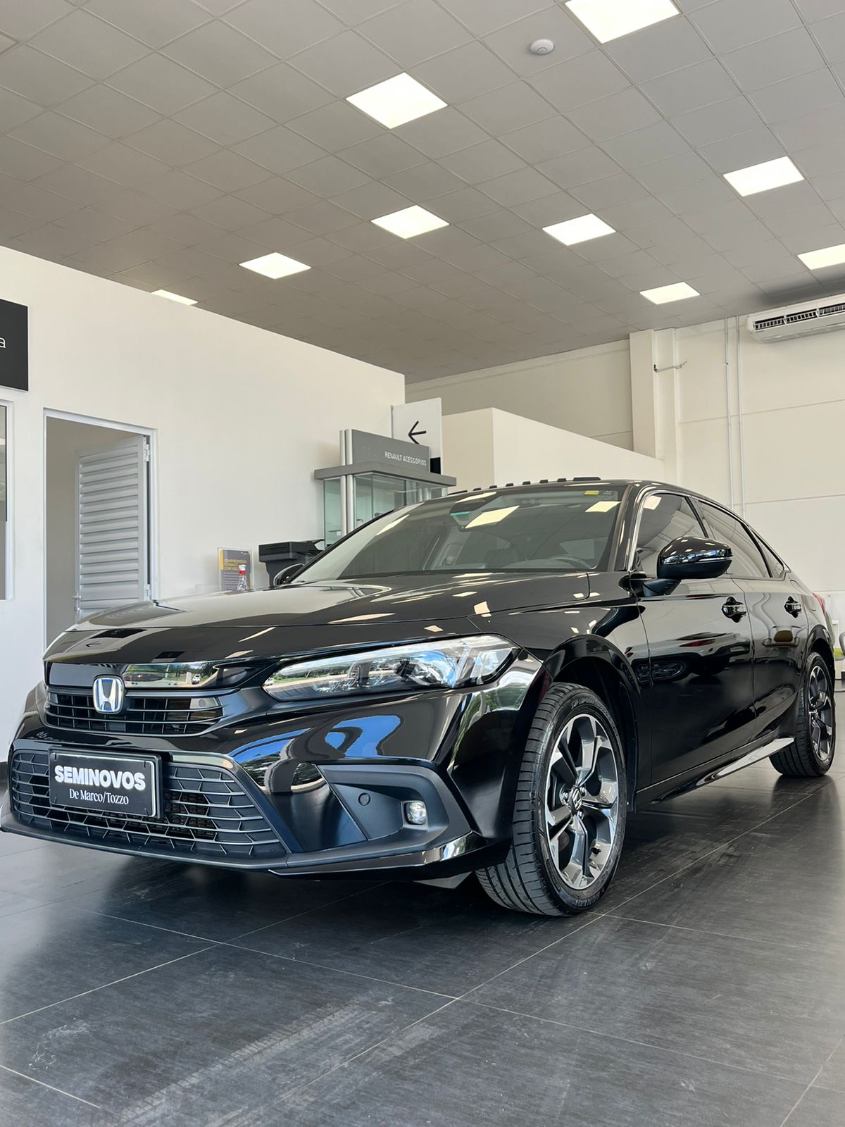 O Honda Civic Sedan Touring 2.0 16v Aut. Híbrido (Advanced Hybrid) é a versão atual do Civic no Brasil, usando um sistema e:HEV com motor 2.0 a gasolina (143 cv) e um motor elétrico potente (184 cv), oferecendo excelente economia (cerca de 18 km/l urbano) e desempenho, com tecnologia de regeneração de energia, modos de condução (EV, Hybrid, Gasoline), câmbio e-CVT, e foco em conforto, tecnologia e segurança, sendo uma opção de alta tecnologia sem necessidade de recarga externa.Motorização e Desempenho:Motor a Combustão: 2.0L DOHC 16V (143 cv, 19.1 kgfm) de ciclo Atkinson, focado em eficiência.Motor Elétrico: 184 cv e 32.1 kgfm de torque, responsável pela maior parte da tração.Sistema: e:HEV (Hybrid Electric Vehicle), gerencia os motores para máxima eficiência, com bateria de íons de lítio.Transmissão: e-CVT, com uma relação para o motor a combustão em alta velocidade e modo elétrico puro.Modos de Condução: EV (Elétrico), Hybrid (Elétrico traciona, motor a combustão gera energia), Gasoline (Motor a combustão traciona em cruzeiro) e Sport, Normal, Econ.Economia e Consumo:Urbano (Gasolina): ~18.3 km/l.Rodoviário (Gasolina): ~15 km/l (dados variam).Tecnologia e Conforto:Painel: Digital TFT de 10 polegadas.Multimídia: Tela de 9 polegadas com Android Auto/CarPlay sem fio e visualização do fluxo de energia.Itens: Teto solar elétrico, ar digital dual zone, bancos elétricos, chave presencial, carregador por indução.ADAS: Honda Sensing (frenagem aut. emergência, alerta faixa, piloto automático adaptativo).Segurança:8 Airbags, controle de tração/estabilidade, ISOFIX, câmera de ré, sensores.Design e Espaço:Sedan de porte maior, porta-malas de 495L, bancos rebatíveis, acabamento refinado.