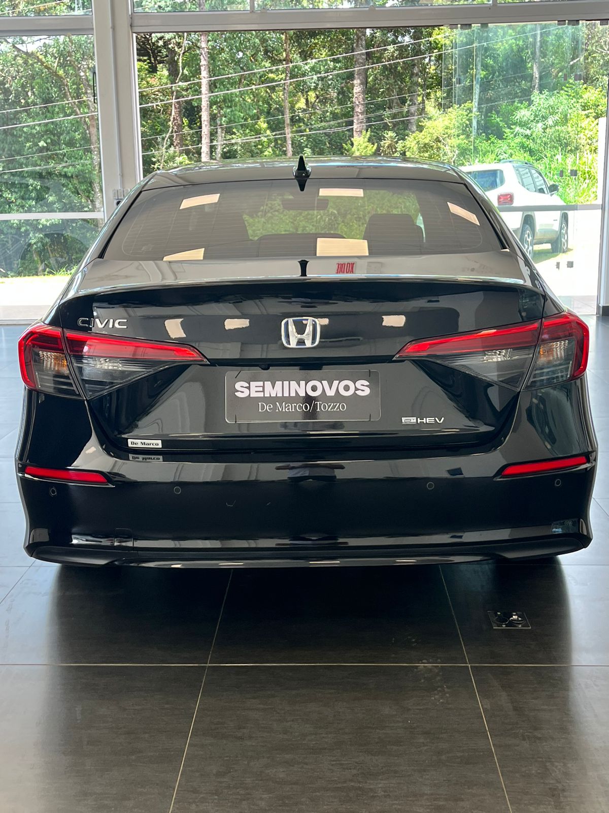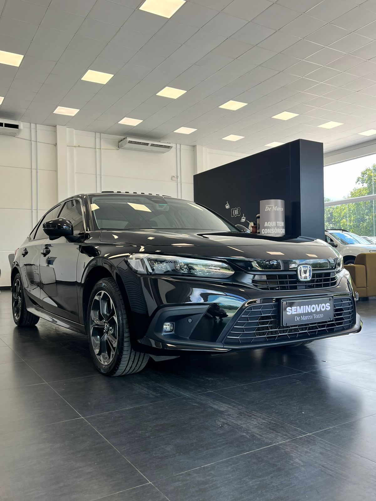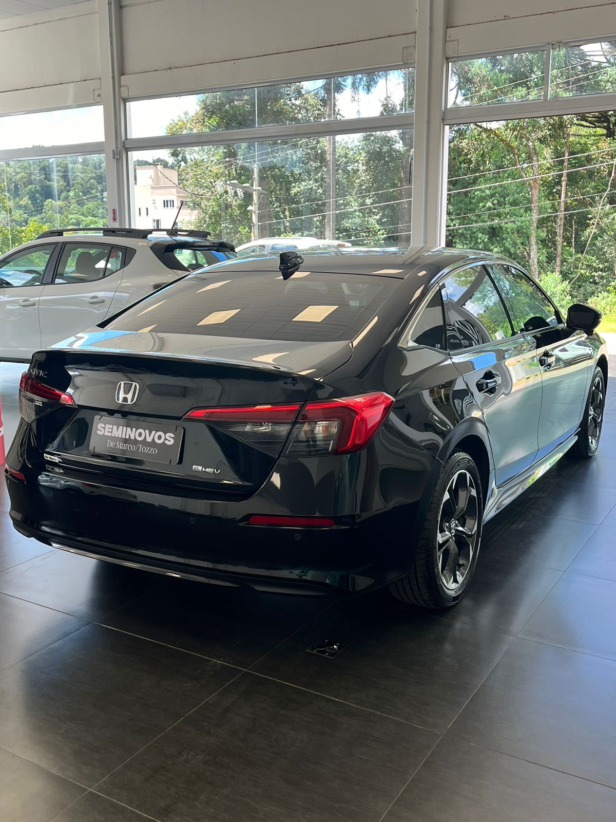 O Honda Civic Sedan Touring 2.0 16v Aut. Híbrido (Advanced Hybrid) é a versão atual do Civic no Brasil, usando um sistema e:HEV com motor 2.0 a gasolina (143 cv) e um motor elétrico potente (184 cv), oferecendo excelente economia (cerca de 18 km/l urbano) e desempenho, com tecnologia de regeneração de energia, modos de condução (EV, Hybrid, Gasoline), câmbio e-CVT, e foco em conforto, tecnologia e segurança, sendo uma opção de alta tecnologia sem necessidade de recarga externa.Motorização e Desempenho:Motor a Combustão: 2.0L DOHC 16V (143 cv, 19.1 kgfm) de ciclo Atkinson, focado em eficiência.Motor Elétrico: 184 cv e 32.1 kgfm de torque, responsável pela maior parte da tração.Sistema: e:HEV (Hybrid Electric Vehicle), gerencia os motores para máxima eficiência, com bateria de íons de lítio.Transmissão: e-CVT, com uma relação para o motor a combustão em alta velocidade e modo elétrico puro.Modos de Condução: EV (Elétrico), Hybrid (Elétrico traciona, motor a combustão gera energia), Gasoline (Motor a combustão traciona em cruzeiro) e Sport, Normal, Econ.Economia e Consumo:Urbano (Gasolina): ~18.3 km/l.Rodoviário (Gasolina): ~15 km/l (dados variam).Tecnologia e Conforto:Painel: Digital TFT de 10 polegadas.Multimídia: Tela de 9 polegadas com Android Auto/CarPlay sem fio e visualização do fluxo de energia.Itens: Teto solar elétrico, ar digital dual zone, bancos elétricos, chave presencial, carregador por indução.ADAS: Honda Sensing (frenagem aut. emergência, alerta faixa, piloto automático adaptativo).Segurança:8 Airbags, controle de tração/estabilidade, ISOFIX, câmera de ré, sensores.Design e Espaço:Sedan de porte maior, porta-malas de 495L, bancos rebatíveis, acabamento refinado.